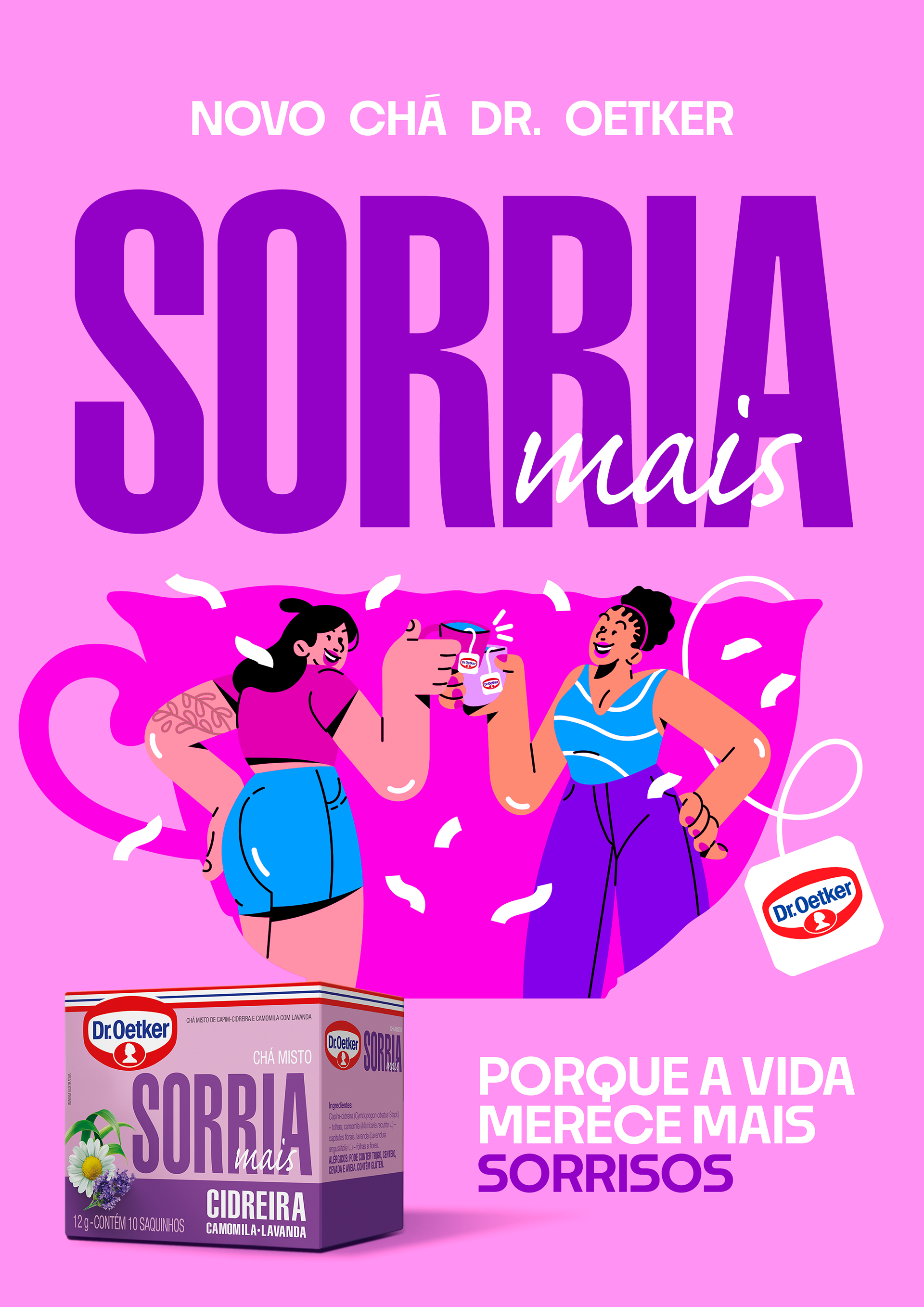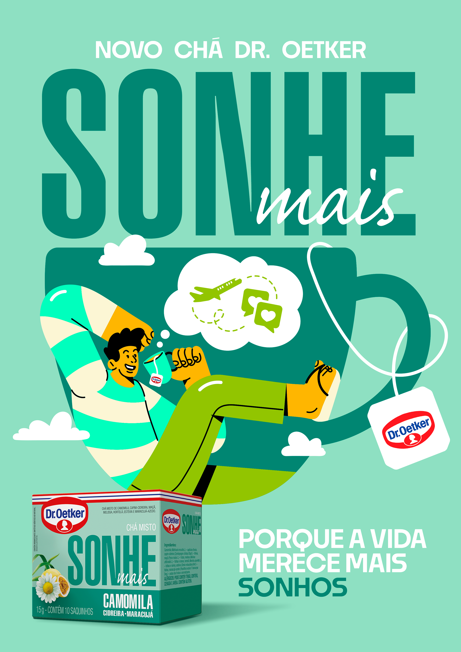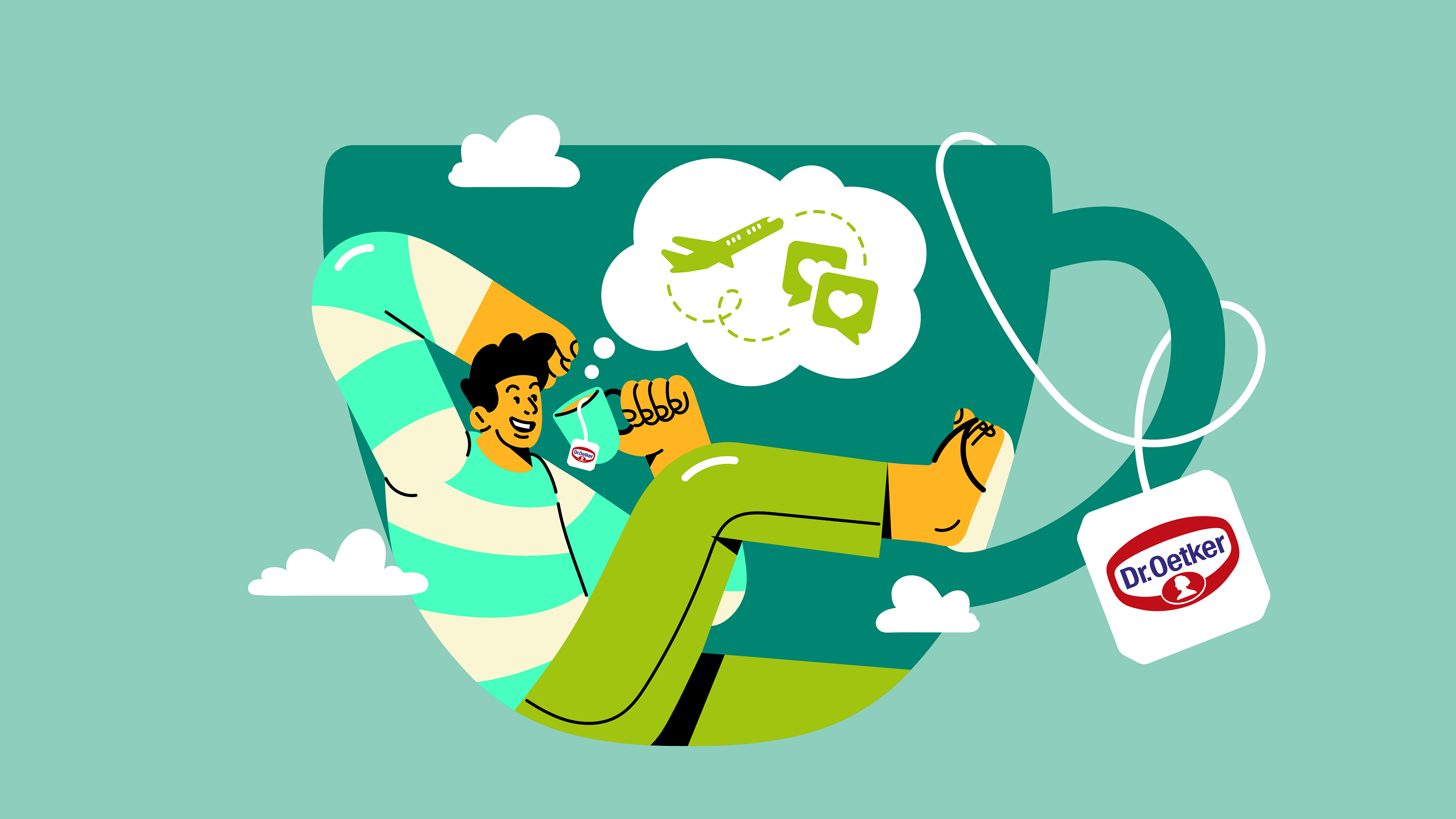 Developed for Dr. Oetker in collaboration with AMPFY, this campaign brings to life the concept “Love, dream, vibrate and smile.” The illustrations were created to promote the new line of Mixed Teas “Mais,” translating everyday emotions into vibrant visual stories.