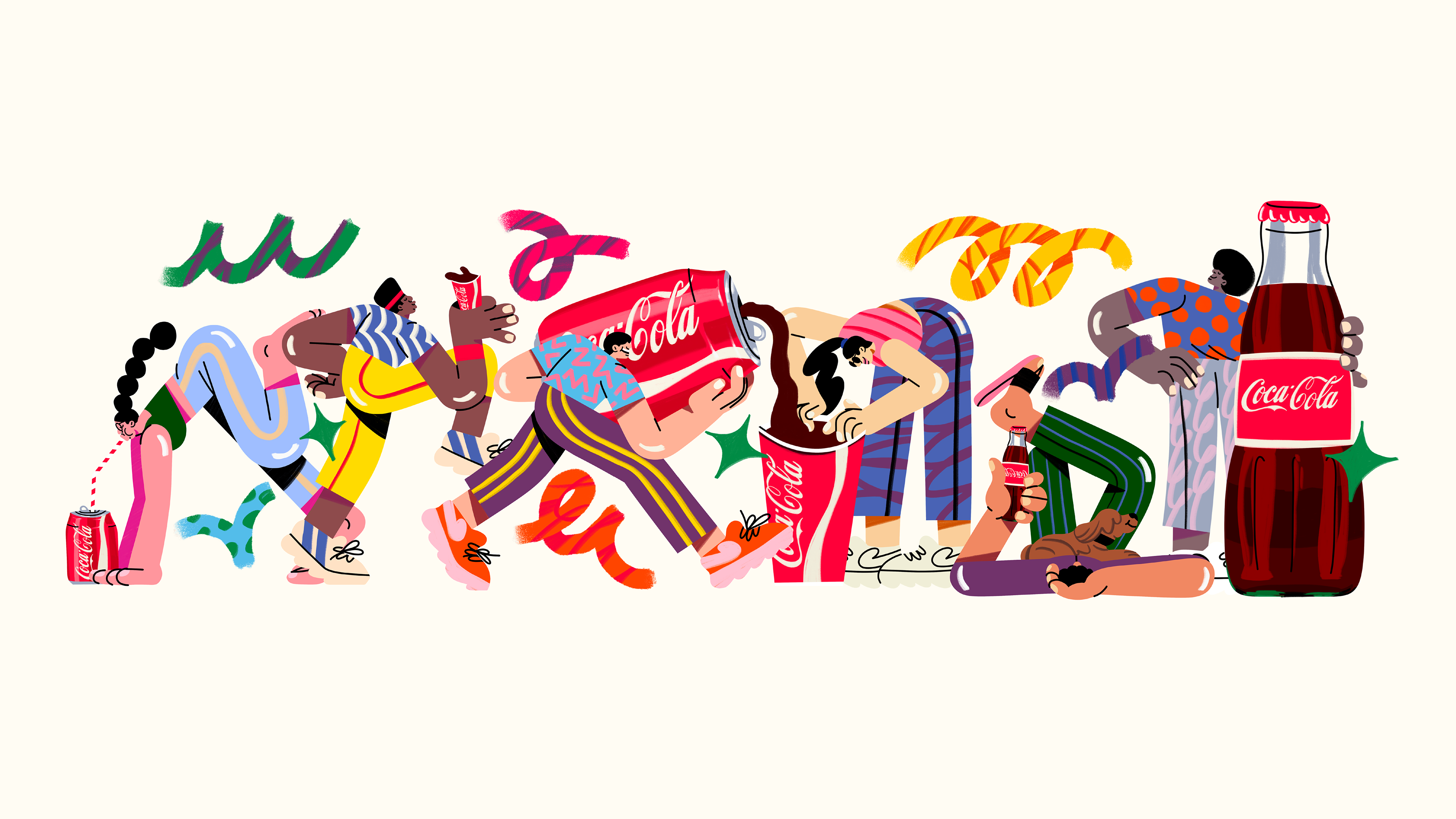This authorial project explores moments of joy and connection inspired by Coca-Cola’s universe. Through vibrant colors, organic shapes, and expressive characters, the illustration celebrates shared experiences and the idea that the best moments are always better together.